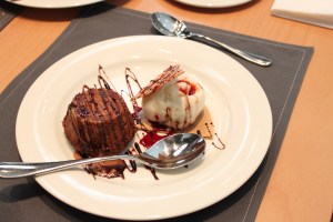 Ιδανικός τρόπος σερβιρίσματος με μία μπάλα παγωτό-κρέμα βανίλια και καραμελωμένο φουντούκι και στολισμένο με σιρόπι σοκολάτας.