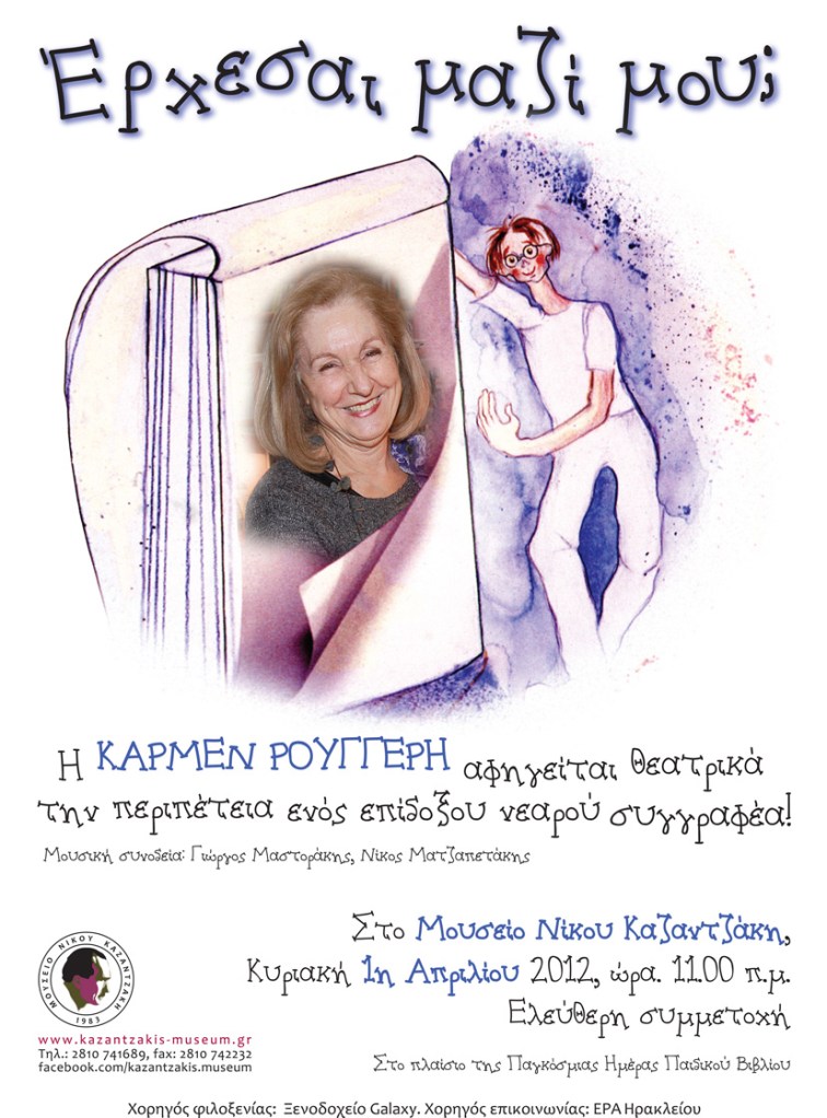 Τιμώμενο πρόσωπο η πολυαγαπημένη των παιδιών Κάρμεν Ρουγγέρη, η οποία θα τους αφηγηθεί το παραμύθι της «Έρχεσαι μαζί μου;» (εκδ. Λιβάνη). Μία καταπληκτική ιστορία για τις περιπέτειες ενός επίδοξου νεαρού συγγραφέα, που προσπαθεί να φτιάξει το δικό του πρώτο παραμύθι. Την αφήγηση θα πλαισιώσουν μουσικά οι Γιώργος Μαστοράκης (κιθάρα) και Νίκος Ματζαπετάκης (μαντολίνο).