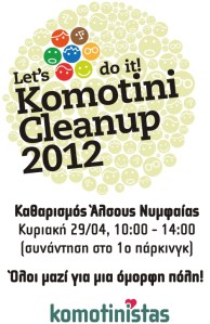 Όπως έχετε ήδη πληροφορηθεί οι περισσότεροι από το site μας, από το Facebook και από τα τοπικά ΜΜΕ, την Κυριακή 29 Απριλίου 2012 συμμετέχουμε στη διεθνή εθελοντική καμπάνια καθαρισμού «Let’s Do It»: