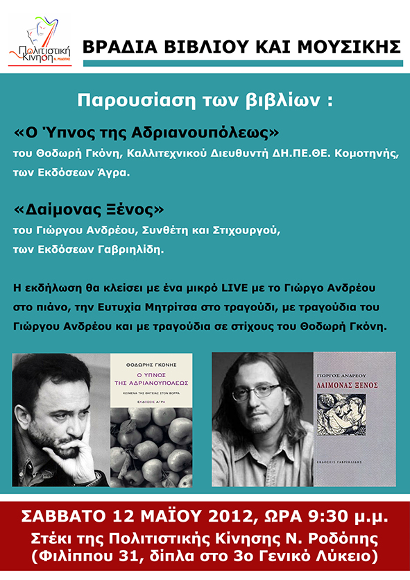 ΣΑΒΒΑΤΟ 12 ΜΑΪΟΥ 2012, ΩΡΑ 9.30 Μ.Μ., ΣΤΕΚΙ ΠΟΛΙΤΙΣΤΙΚΗΣ ΚΙΝΗΣΗΣ ΝΟΜΟΥ ΡΟΔΟΠΗΣ