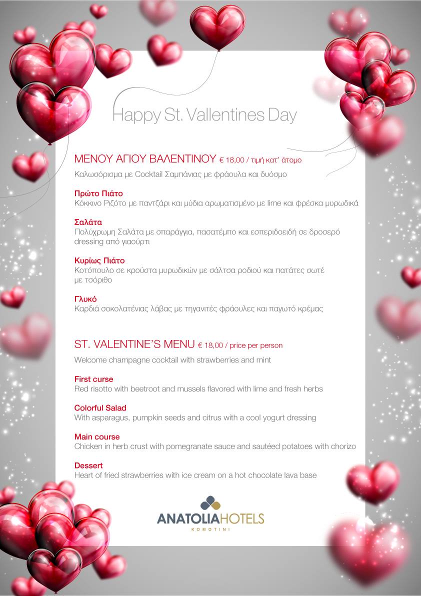 Ένα εξαιρετικό μενού του chef Παναγιώτη Μπάτζιου, συνοδευμένο από τις μουσικές επιλογές dj για την ημέρα του Αγίου Βαλεντίνου. Συνίστανται οι κρατήσεις στο 2531036242!