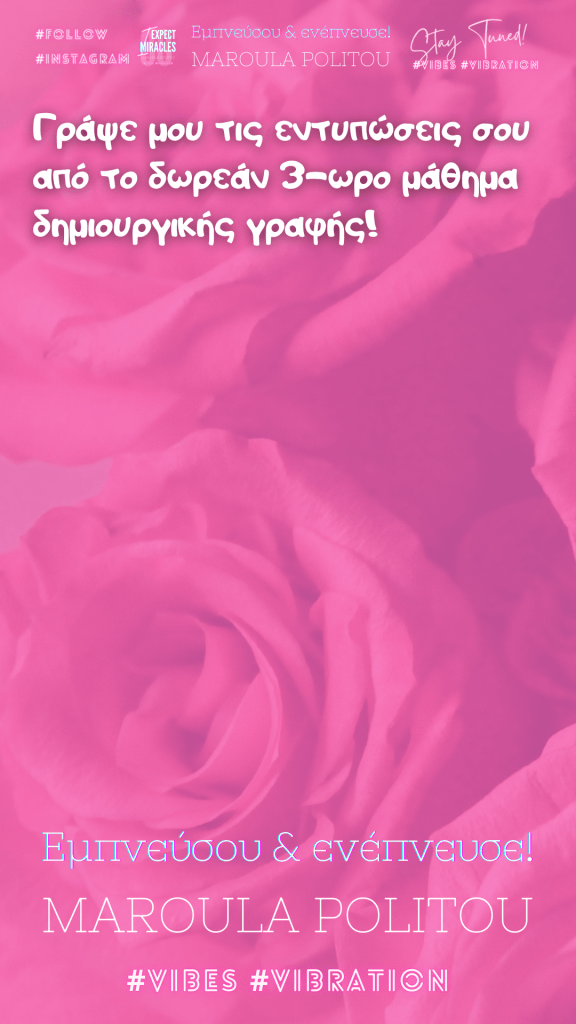 Μπορείτε να με βρείτε άμεσα κι γρήγορα στον επαγγελματικό μου λογαριασμό στο Instagram για να διεκδικήσετε και την δωρεάν συνεδρία όπως και να πληροφορηθείτε για τα πιο καινοτόμα σεμινάρια δημιουργικής γραφής στην ελληνική αγορά!